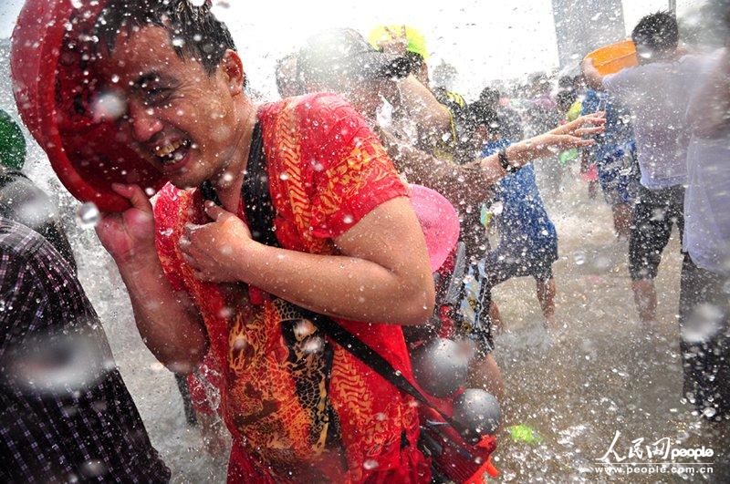 人民网西双版纳景洪4月16日电 (记者 常红)4月15日是2014年西双版纳泼水节,数万名当地群众穿上节日盛装,和外地游客一起在云南省西双版纳傣族自治州景洪市互相泼水,互祝吉祥、幸福、健康。整个西双版纳都沉浸在泼水节的狂欢气氛中,不仅在澜沧江畔举办了傣历新年泼水节取水仪式,西双版纳首府景洪市泼水广场更是热闹非凡。