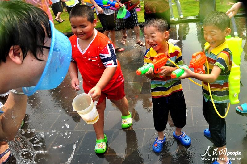 泼水广场的水战中小朋友勇敢地直面水枪的“攻击”-摄影徐毅然