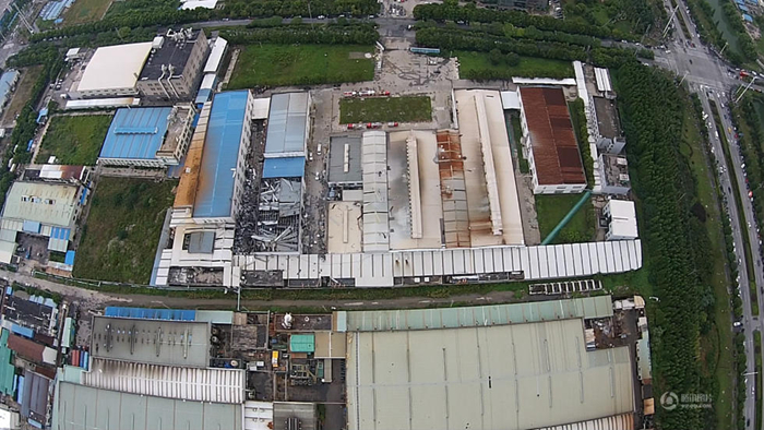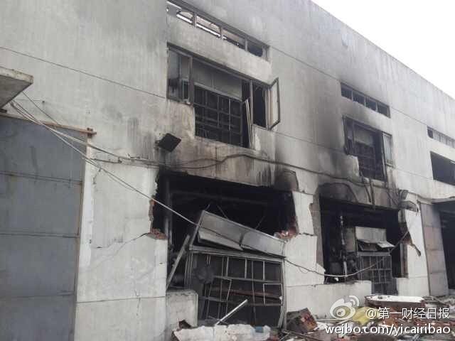 “新华视点”记者在爆炸的车间门口看到,车间中部位置外墙损伤严重,爆出两个大洞,外墙部分被爆炸引起的烟火熏黑。车间所有玻璃碎裂,部分墙体只剩下钢筋结构。