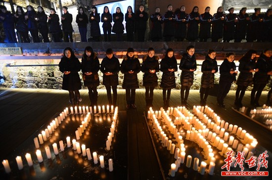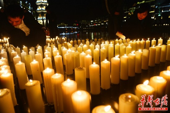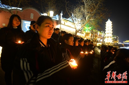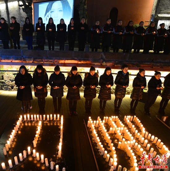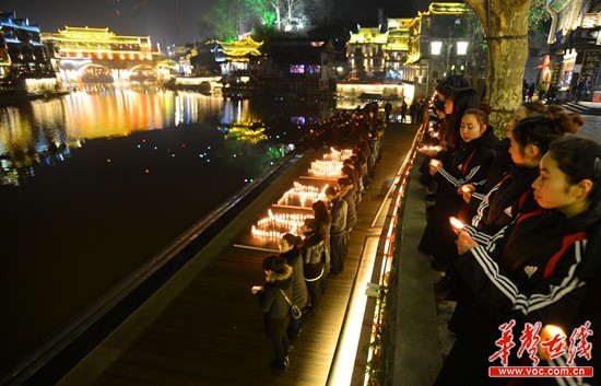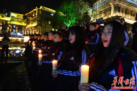 “清晨,你披一袭轻纱,柔柔地唤醒了凤凰。傍晚,你穿一身霓裳,暖暖地照亮凤凰。你从苗岭深处走来,一湾秀水牵动爱的山岗,吊脚楼的传说在你的碧波里荡漾,那些浪漫的月亮小船在你的浪花里歌唱……”1月20日晚,湖南凤凰古城的沱江边,1000多名游客在江畔上点起蜡烛,齐唱歌曲《唱给沱江》,追悼著名青年歌手姚贝娜并为她祈福。2008年,刚获得第十三届CCTV青年歌手电视大奖赛流行唱法金奖,姚贝娜就应邀倾情演唱了《唱给沱江》。这首歌还在凤凰古城取景,拍摄了MTV。湖南日报记者 徐行 摄