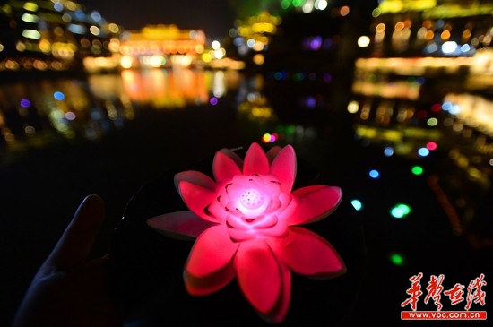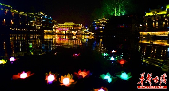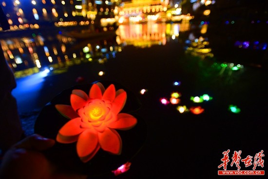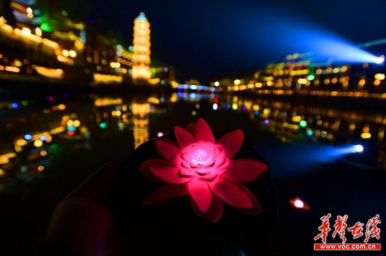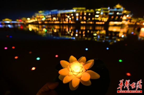 20日19时许,凤凰古城的沱江上静静漂流着上百盏河灯,一千多名凤凰民众手持烛火,齐声歌唱《唱给沱江》,为已在天堂的姚贝娜祈福。