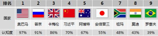 调查发现,在九个国家的领导人中,习近平以70%的认知度位列第四。知名度排在前三的领导人依次是美国总统奥巴马(97%)、俄罗斯总统普京(91%)以及英国首相卡梅伦(86%)。