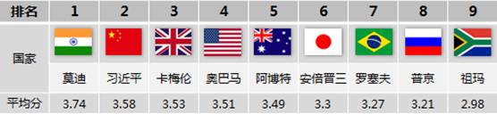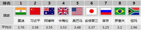 此外,不论是国内事务还是国际事务,习近平的处理能力都得到了很高的评价。在进行调查的九个国家中,习近平的国内、国际事务处理能力认可度均排在第二位,仅次于2014年新当选的印度总理莫迪。