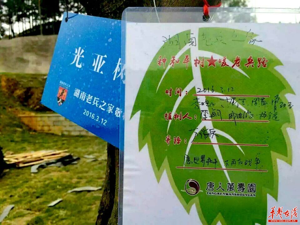 3月12日植树节当天,湖南唐人万寿园抗战主题陵园举行公益植树活动,湖南老兵之家志愿者相约前来,挖土、放树、埋土、浇水,并挂上事先准备好的铭牌,一棵“光亚树”终于呈现在所有人面前。