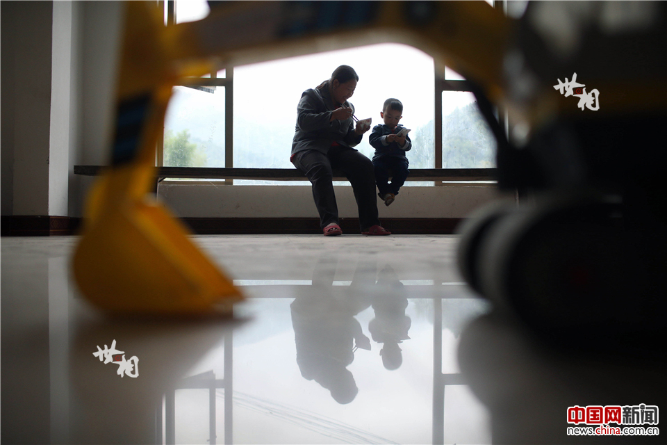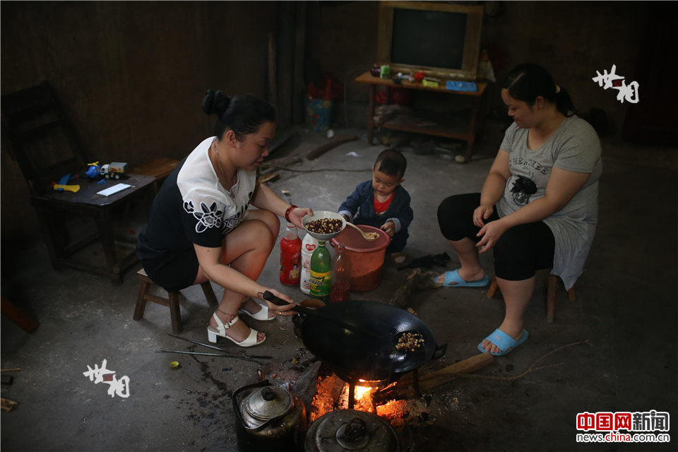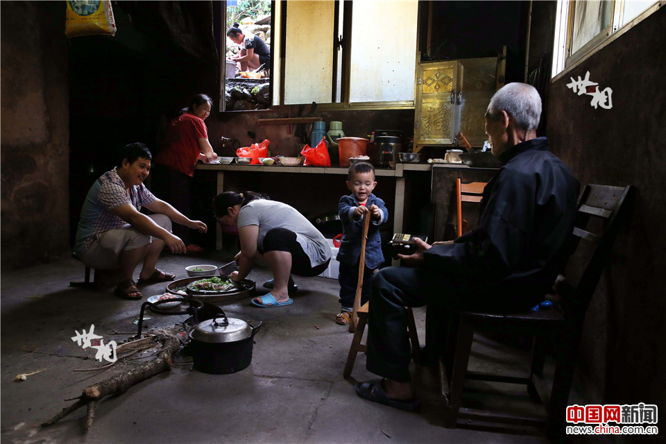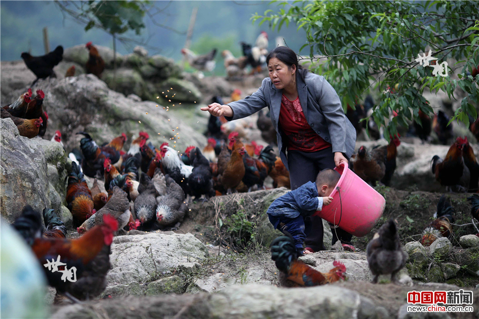 苗族的侯日孟带着孙子一起在喂鸡。她说,一大家子人吃饭,她不想拖后腿,尽力做点事,减轻大家的负担。