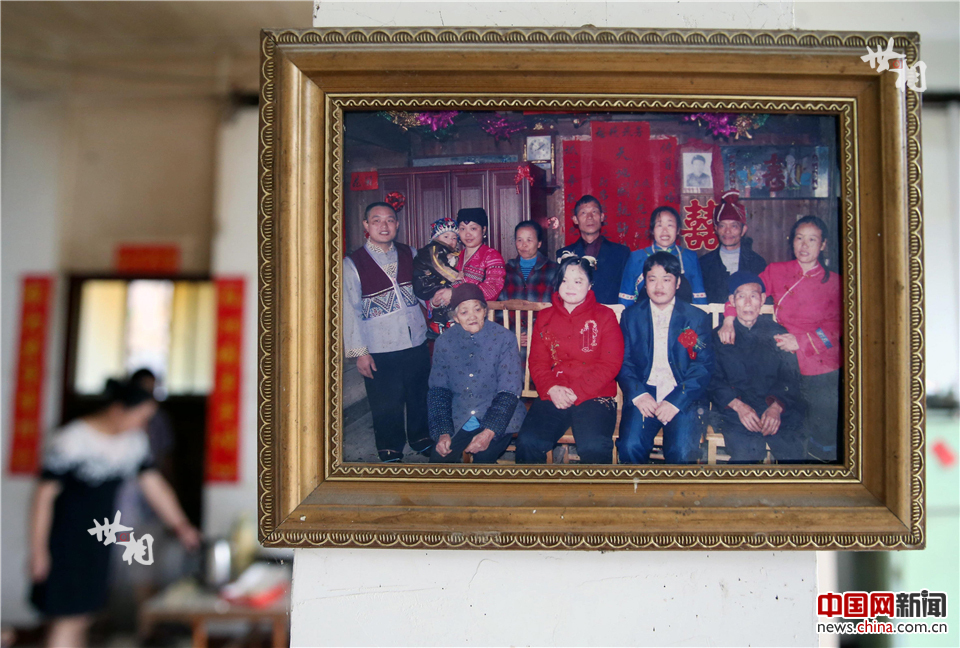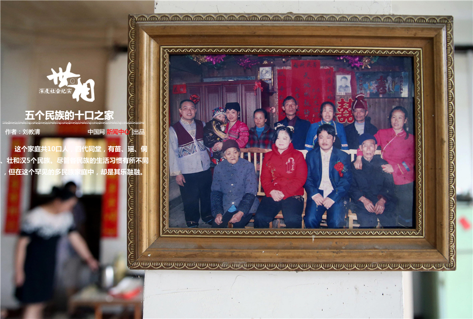 这个十口之家,共有五个民族。今年93岁的侯正荣(前排中)为壮族,潘艳梅(后排左一)为瑶族,侯光祖(后排左二)为侗族,侯日孟(后排左三)为苗族,王成建(后排右三)为侗族,侯光源(后排右二)为壮族,黄世红(后排右一)为汉族。