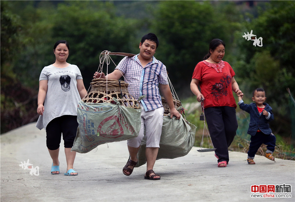 自2005年起,侯光源一直在广东一带打工。2016年5月12日,他带着妻子回到故土,决定在家干一番事业。每次回家,他与妻子黄世红都争着帮家人做事。这是他挑着母亲养的土鸡准备上街卖的情景。