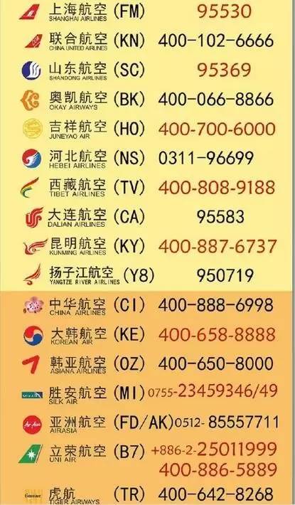 航空公司代码及服务热线(滑动可查看全部):