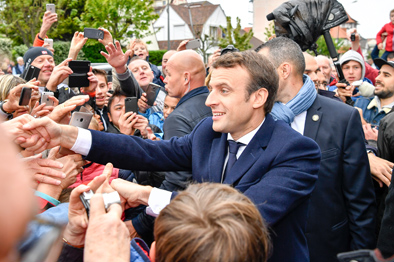 资料图:5月7日,在法国勒图凯,“前进”运动候选人埃马纽埃尔·马克龙(中)在投票前向支持者致意。2017年法国总统选举第二轮投票当地时间7日上午8时在法国本土全面展开,在第一轮投票胜出的“前进”运动候选人埃马纽埃尔·马克龙和极右翼政党“国民阵线”候选人玛丽娜·勒庞将为总统职位展开最后对决。新华社记者陈益宸摄