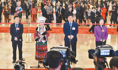 5日,全国人大代表左香云、杨昌芹、巩保雄、郭凤莲(从左至右)在“代表通道”接受采访。翁奇羽摄(人民视觉)