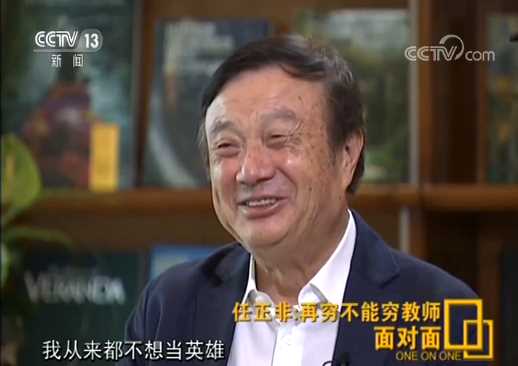 任正非:不接受,狗熊。我根本就不是什么英雄,我从来都不想当英雄。任何时候我们是在做一个商业性的东西,商品的买卖不代表政治态度,这个时代变了,怎么买苹果手机就是不爱国哪能这么看,那还开放给人干什么?商品就是商品,商品是个人喜好构成的,这根本没啥任何关系。媒体炒作有时候偏激,偏激的思想容易产生民粹主义,对一个国家是没好处的。