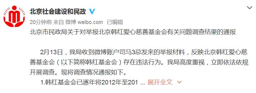 2月13日,我局收到微博账户司马3忌发来的举报材料,反映北京韩红爱心慈善基金会(以下简称韩红基金会)存在违法行为。我局高度重视,立即依法依规开展调查。现将调查情况通报如下。