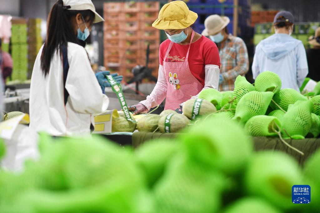 7月19日,工人在银川市兴庆区月牙湖乡穹顶(宁夏)生态科技有限公司蜜瓜种植基地分拣、包装蜜瓜。