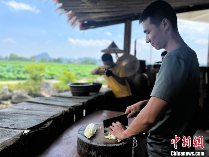 在广西柳州市柳江区百朋镇,队友拍摄韦文员切菜画面,制作家乡美食视频。李娇阳 摄
