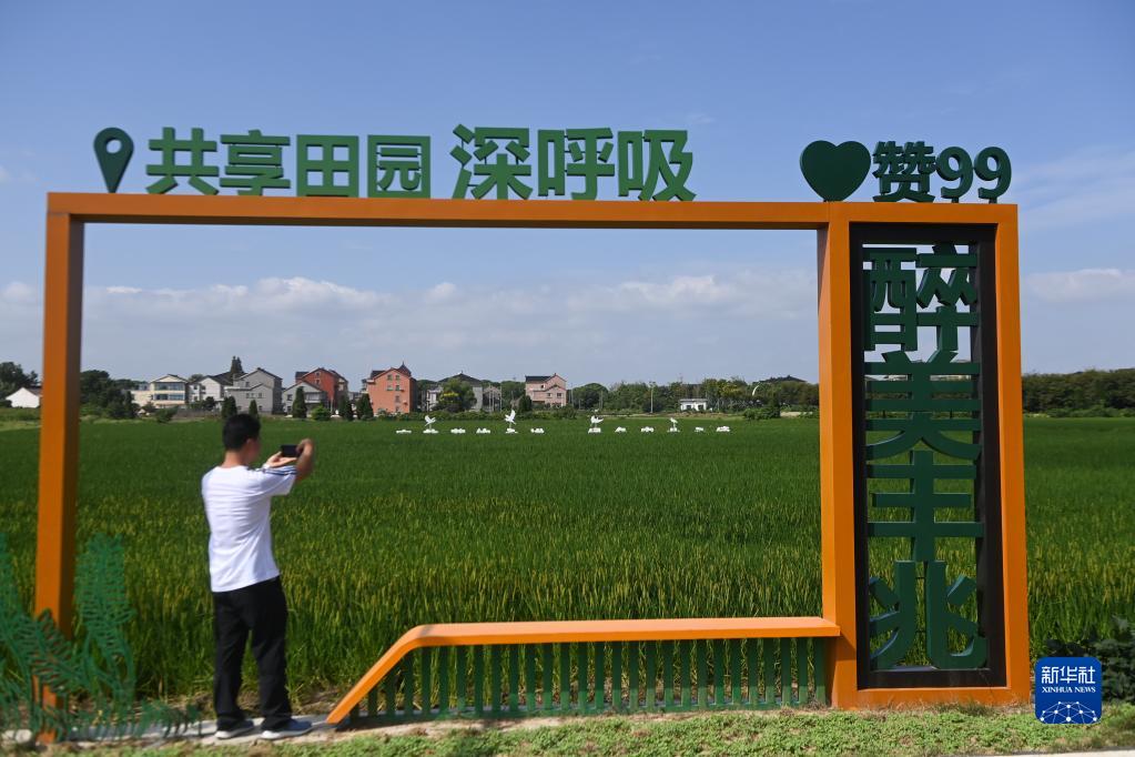 9月20日,织里镇陆家湾村村民在稻田旁拍摄美景。