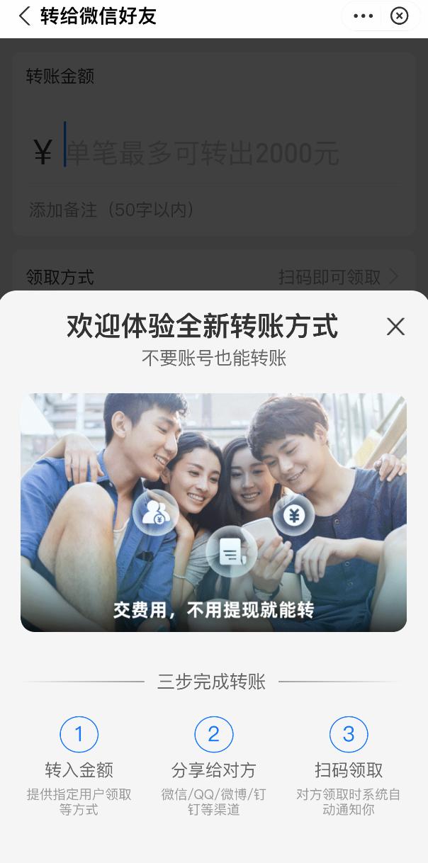 10月16日,经实测证实,支付宝已可以给微信好友转账了,但不是直接转账,而是输入金额后会生成一个二维码,然后微信/QQ 可以扫码领取,超过24小时未领取会自动退回。单笔最多可转出2000元。