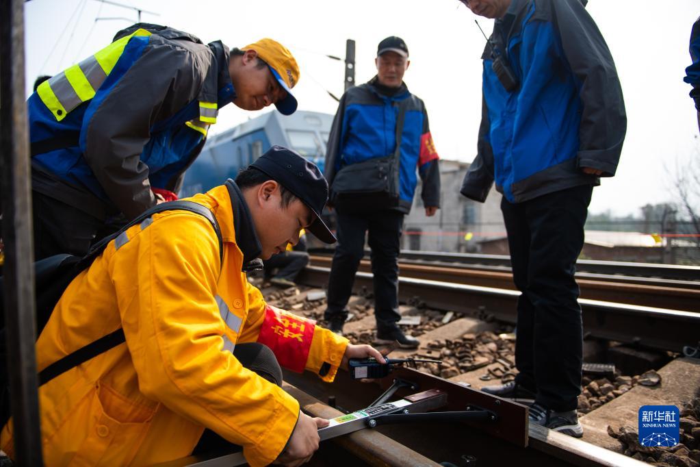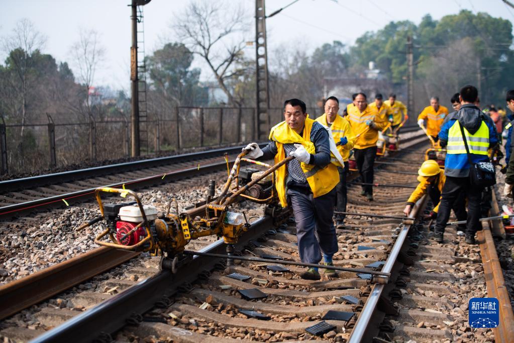 2月19日,在沪昆铁路娄底至湘潭东区间,工人在移动螺栓松紧机。