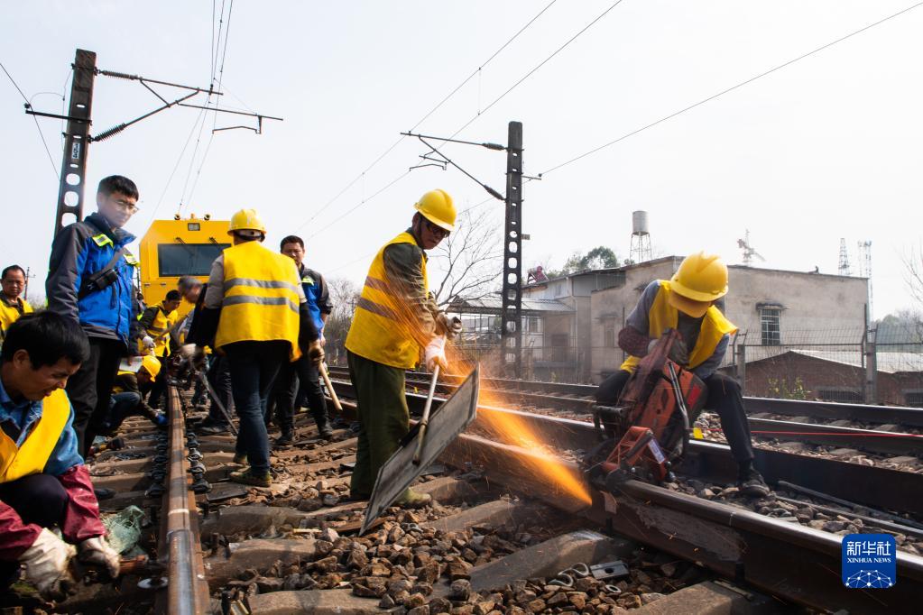 2月19日,在沪昆铁路娄底至湘潭东区间,铁路工人在锯轨。