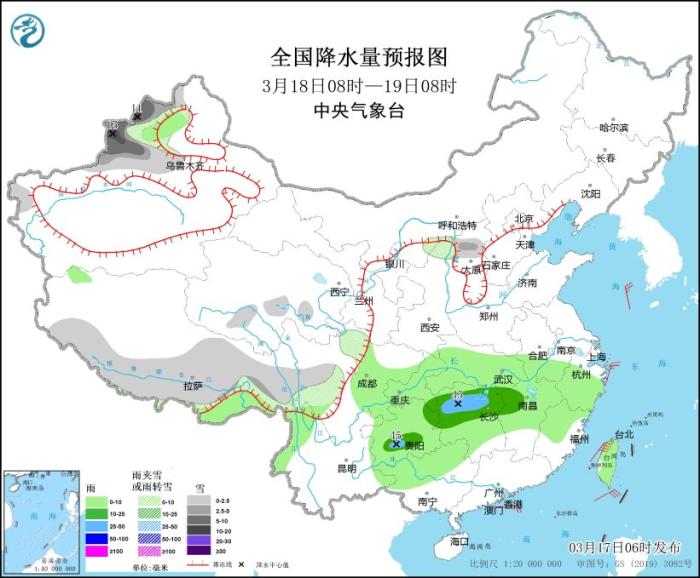 3月18日08时至19日08时,新疆西北部和沿天山地区、西藏南部和东部、青海南部、山西北部等地部分地区有小到中雪或雨夹雪,其中,新疆伊犁河谷等地局地有大有暴雪(10~15毫米)。贵州中部和东北部、湖南中北部、江西西北部等地部分地区有中到大雨(25~45毫米)。
