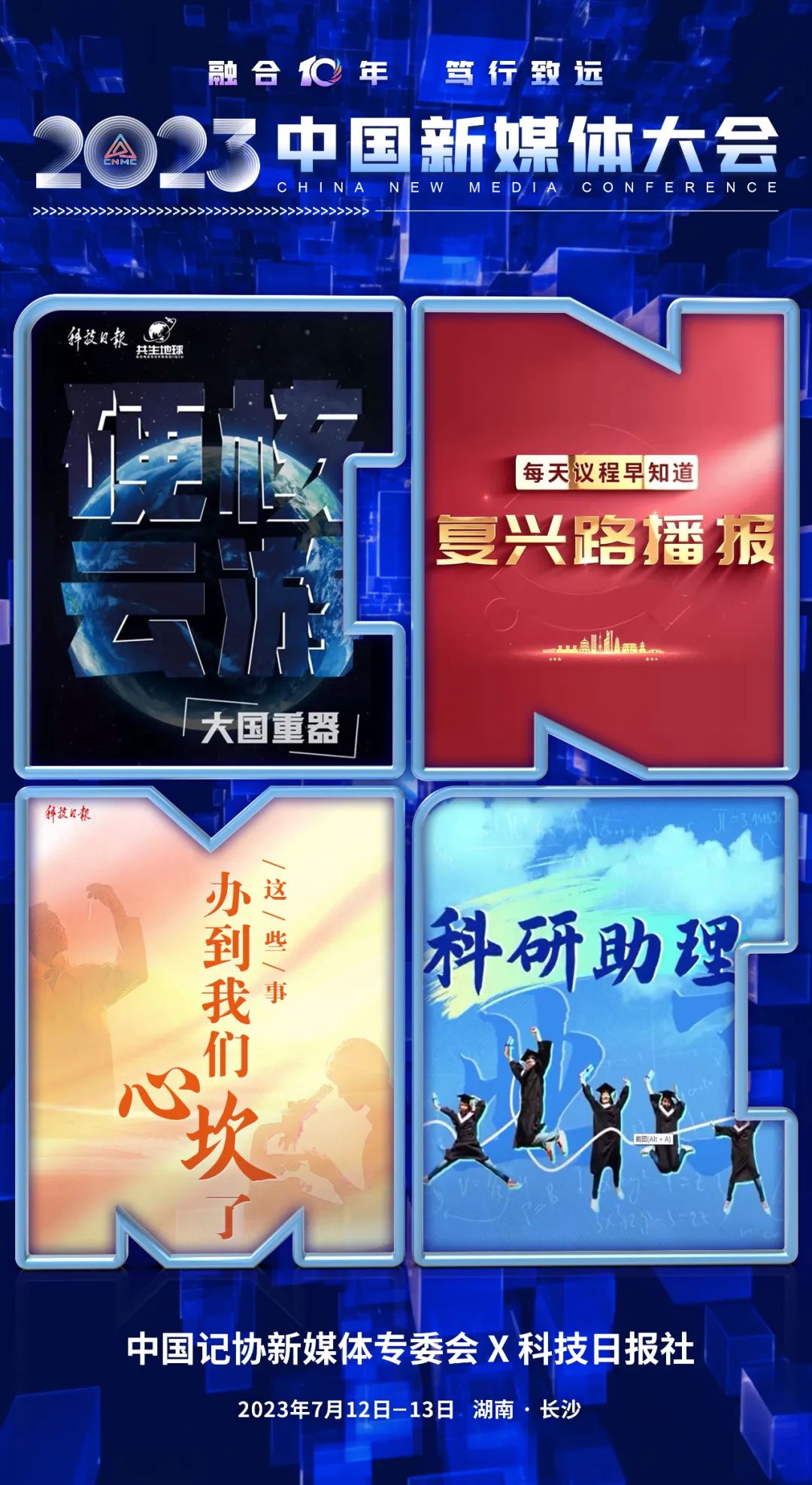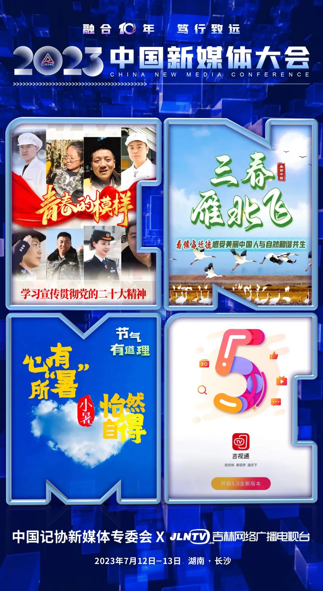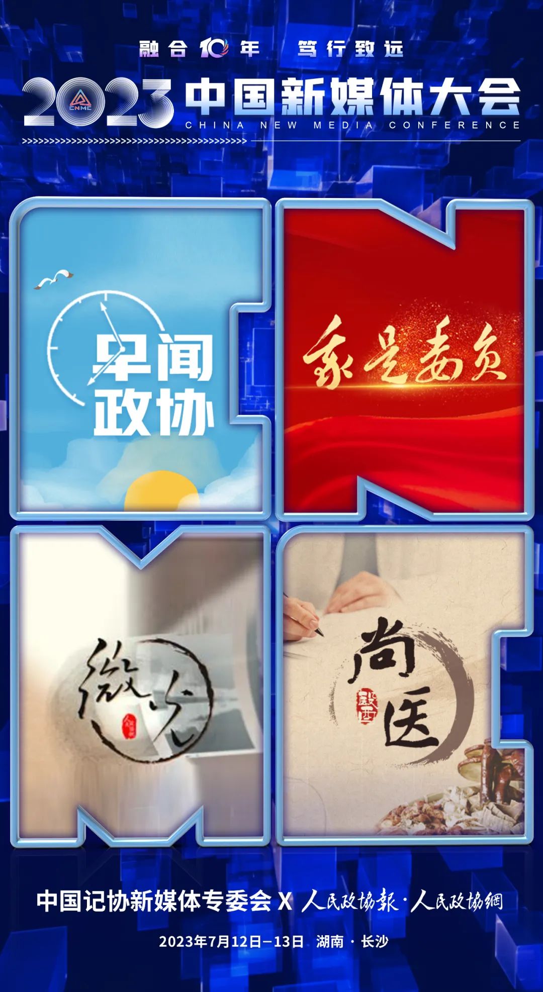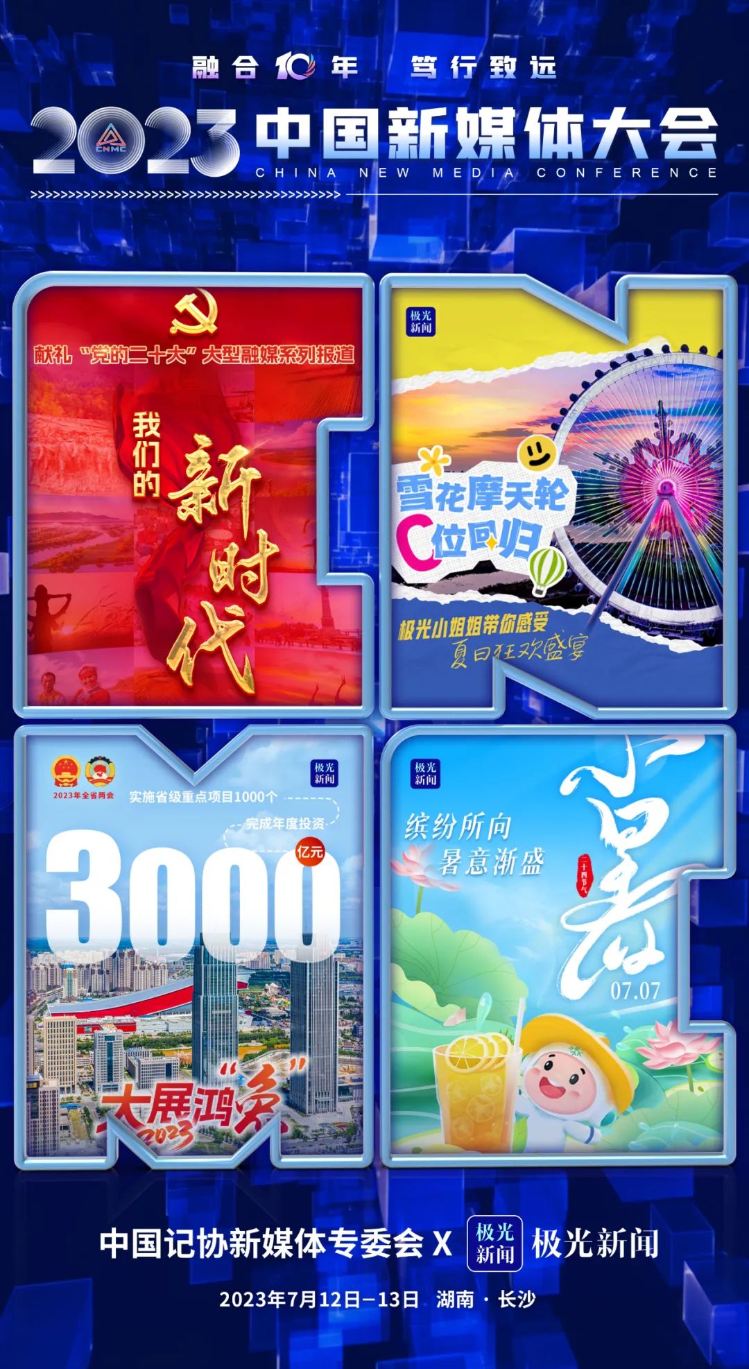 2023中国新媒体大会将于7月12日至13日在湖南长沙召开,中国记协新媒体专业委员会各成员单位纷纷推出“联名海报”为大会预热。