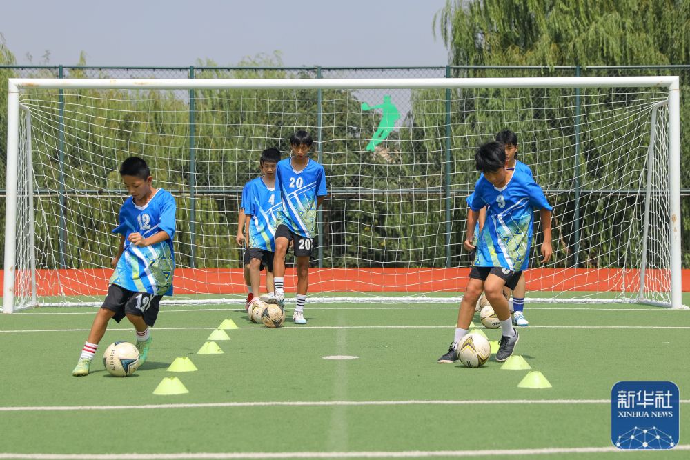 ↑9月7日,山东省青岛第三十三中学的学生在进行足球训练。新华社发(张鹰 摄)