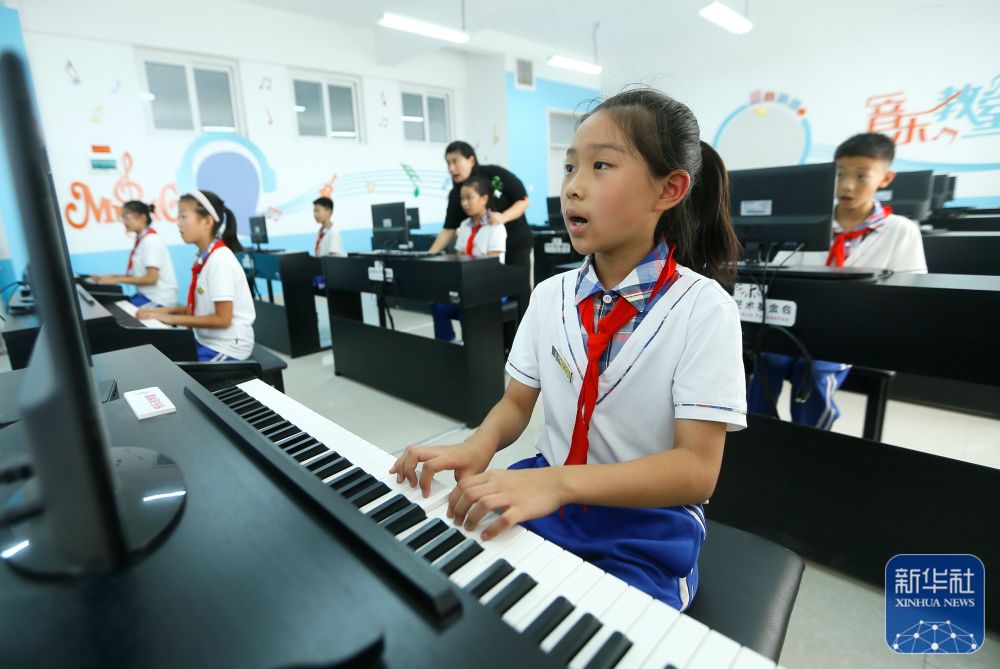 ↑9月7日,山东省青岛市即墨区龙山中心小学的学生在学习弹钢琴。新华社发(梁孝鹏 摄)