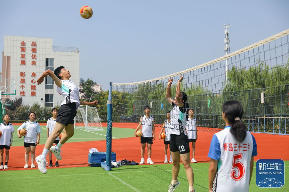 ↑9月7日,山东省青岛第三十三中学的学生在进行排球训练。新华社发(张鹰 摄)