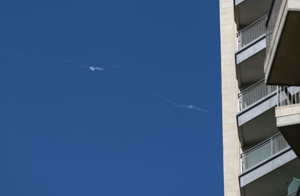 ↑这是10月7日在耶路撒冷拍摄的以色列“铁穹”防御系统拦截火箭弹后的烟雾。新华社记者 陈君清 摄