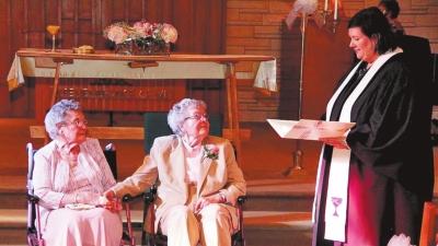 91岁的维维安·博亚克和90岁的艾丽斯·杜比本月6日在美国艾奥瓦州完婚。她俩在少年时代相识,此后相伴72年。70多年间,她俩游遍美国50个州和加拿大所有省,还去了两次英格兰。过去,受法律限制,两人始终没有举行婚礼。艾奥瓦州2009年批准同性婚姻后,两人开始考虑开启生活的新篇章。在婚礼上,她们各自坐在轮椅上,听牧师念婚词,艾丽斯还把手搭在维维安的手上。“我们度过了美好时光,”艾丽斯说。(凌朔)
