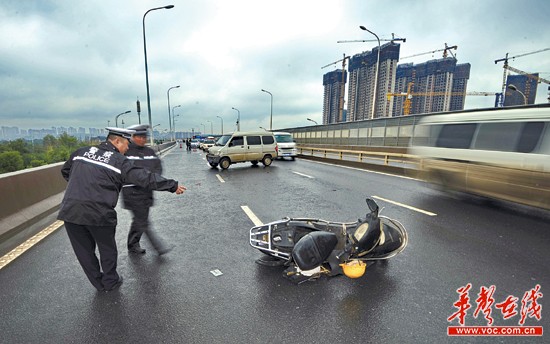 10月30日上午,长沙市湘府路大桥洋湖湿地公园路段,一辆电动车因临时变道,被身后的面包车顶飞了十几米远,电动车车主当场昏迷。记者 童迪 摄
