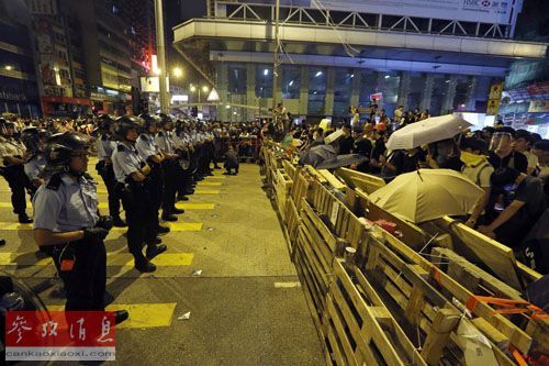 资料图片:香港警方强烈谴责“占中”示威者堵路和冲击警方防线的行为。