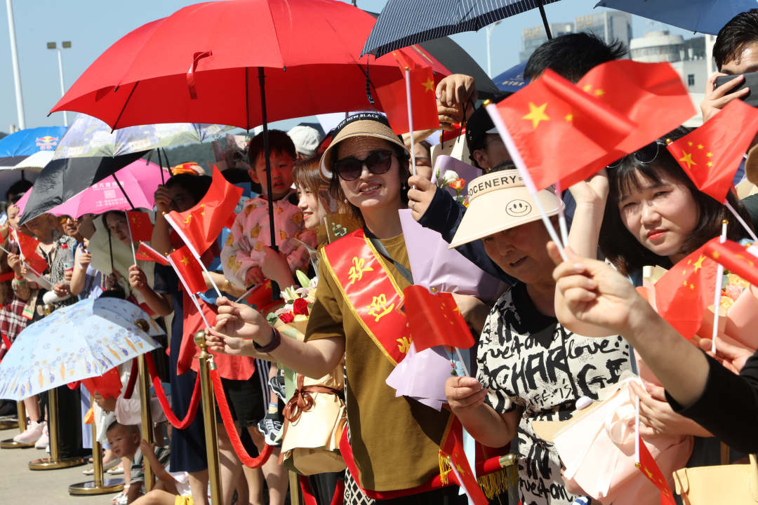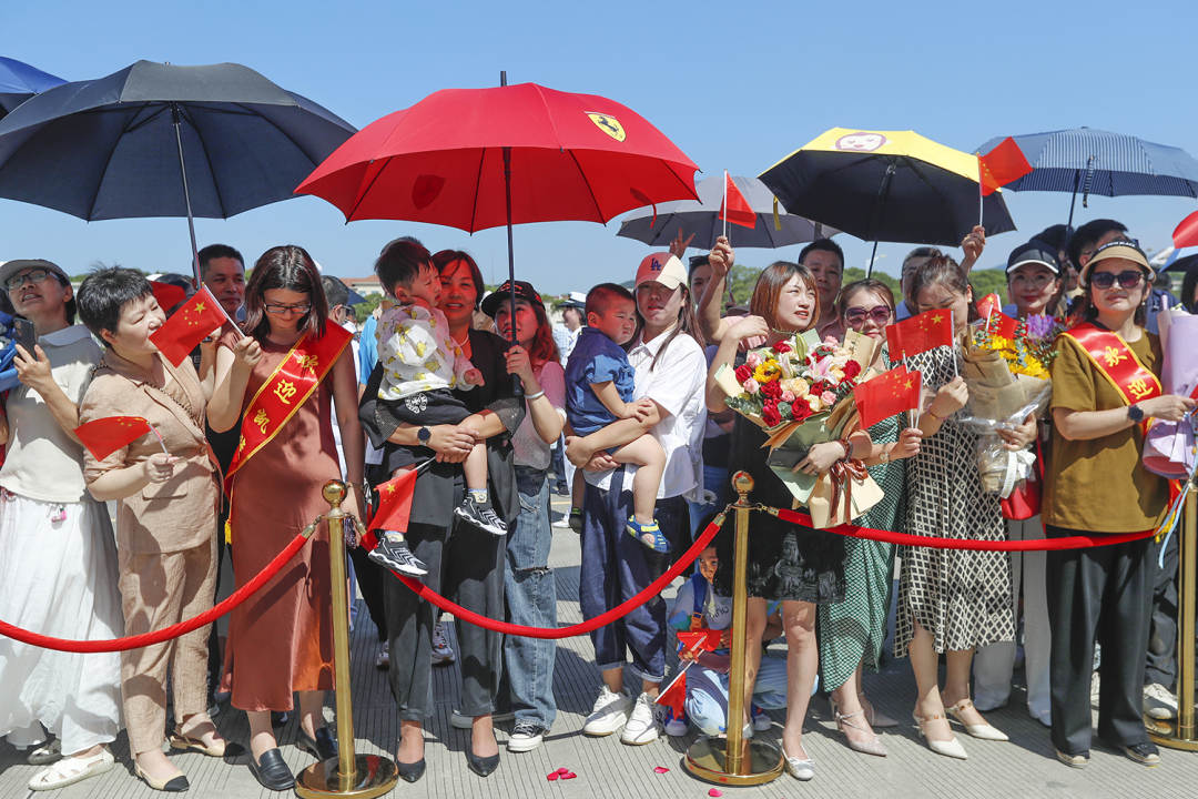 东部战区海军领导及任务官兵家属代表在码头迎接。