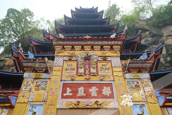 记者看到,整个山门都饰以精致浮雕、泥塑构成,主体建筑为红色的全木塔形楼阁,工艺独特,被誉为我国南方民间建筑的一颗璀璨明珠。12层的寨楼,通高45米,临岩筑基,依山取势,分为上下两部分,下9层隐含九重天之意,上3层寓意“天外有天”,是我国现存最高,层数最多的穿斗式全木质结构建筑。