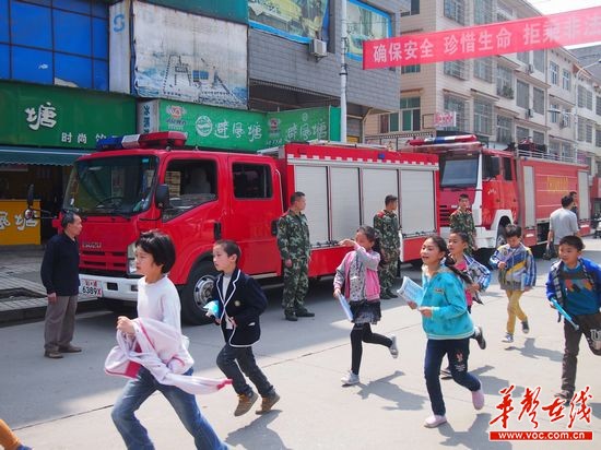 华声在线5月13日讯(通讯员 殷旺洋 杨贤婷 张晨)5月12日上午,武冈市东方红小学113班全体学生正坐在教室里跟着许老师齐读《望庐山瀑布》,突然校园四周响起惊天动地的剧烈爆炸声。十万火急之时,防空警报立刻在校园响起,有人在广播里一遍遍指挥:“请各班师生不要慌张,在操场迅速集合后,撤入安全地带!”许老师紧张有序地组织全班同学赶赴操场。5分钟全校师生全部集合完毕,警报再次拉响,全校师生在统一指挥下,跑步前进至王城公园安全地带,成功实现疏散。这是该市人防办牵头组织的防空袭实战演练的一个现场。爆炸声是从该校5个喇叭里面同时播出的模拟声。