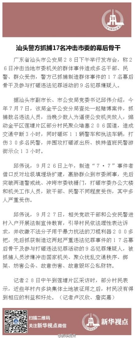 @新华视点:【汕头警方抓捕17名冲击市委的幕后骨干】26日,制造“7·7”事件者借口反对垃圾填埋场扩建,裹胁群众到市委闹事,打砸办公楼、打伤机关工作人员和民警。目前,警方已抓捕制造群体事件的17名幕后骨干及参与打砸违法犯罪活动的9名犯罪嫌疑人。以下为详文:
