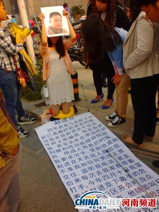 中国日报网河南频道10月13日电 (本网记者)10月8日上午,郑州市郑东新区商务外环与商务西四街交叉口一女子跪地举牌,声称自己被河南省房地产业商会常务副会长兼秘书长赵某某“欺骗玩弄近4年”。其双手举着被举报人的头像照片,面前地上摆放着一张打印好的举报材料。