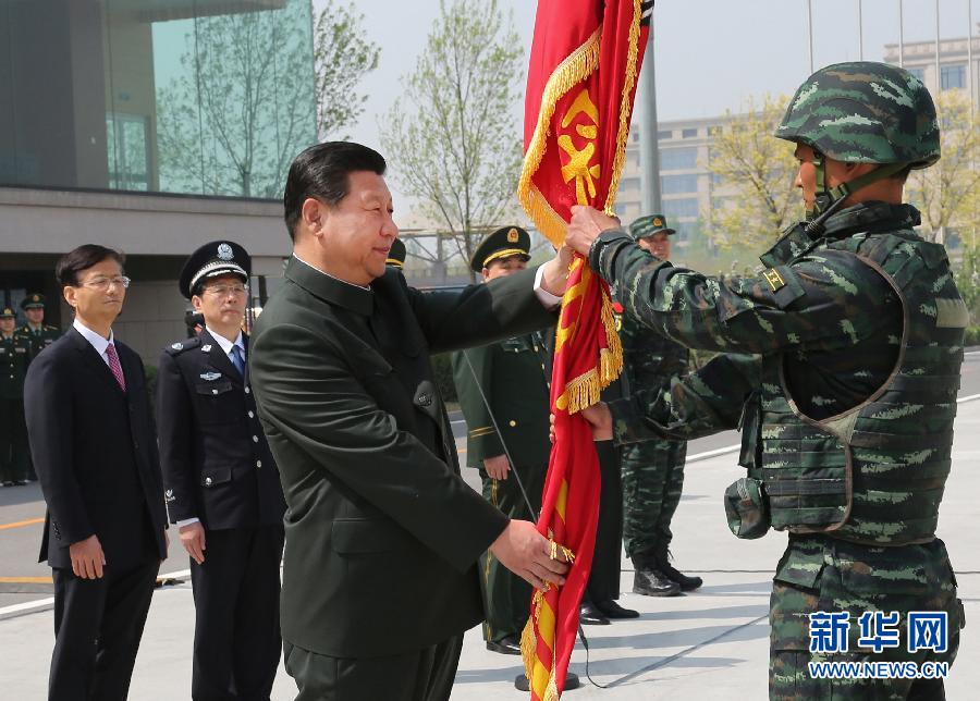 2014年4月9日,中共中央总书记、国家主席、中央军委主席习近平视察武警部队特种警察学院,并为“猎鹰突击队”授旗。这是习近平将队旗郑重授予“猎鹰突击队”大队长。