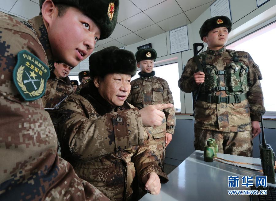 2014年1月26日,中共中央总书记、国家主席、中央军委主席习近平专程来到内蒙古军区边防某部,亲切看望慰问戍边官兵。这是习近平仔细察看三角山哨所执勤设施,动情地对执勤哨兵说:“今天,我和你们一起执勤站岗。”