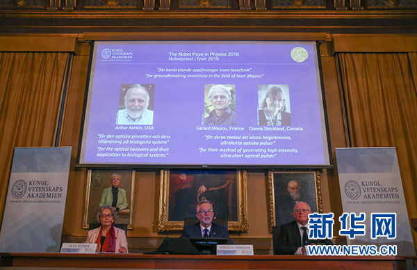 10月2日,瑞典皇家科学院在斯德哥尔摩举行新闻发布会,公布2018年诺贝尔物理学奖获得者。新华社记者 叶平凡 摄