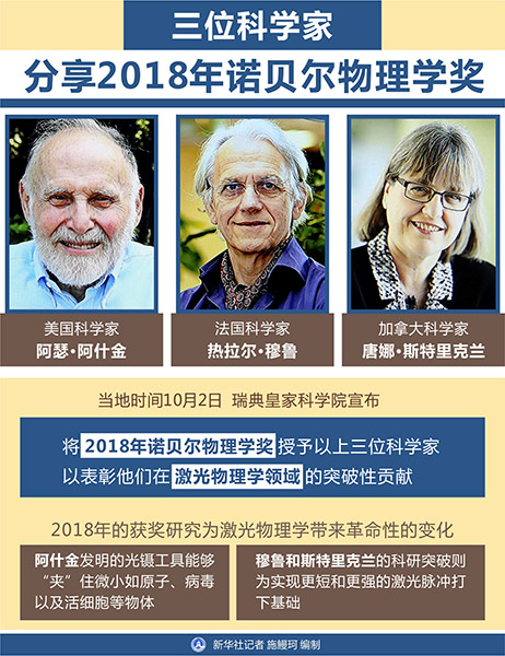 图表:三位科学家分享2018年诺贝尔物理学奖 新华社记者 施鳗珂 编制
