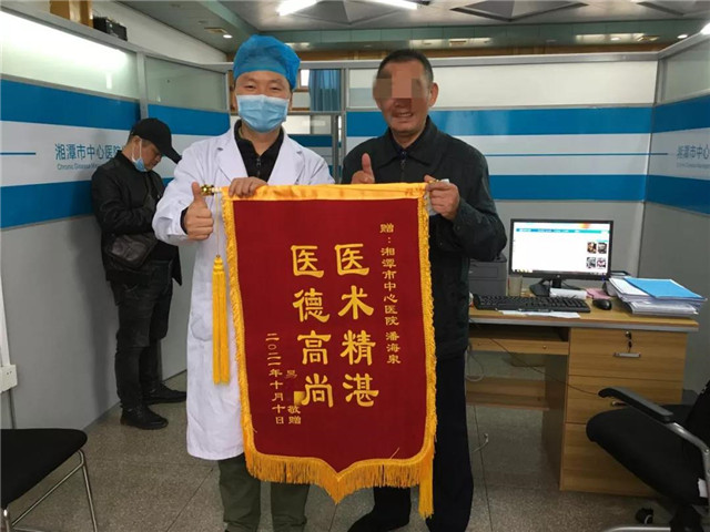 “十一”长假过后,湘潭市中心医院门诊6楼一位老年人满面笑容将写有“医术精湛 医德高尚”的锦旗送给慢性病管理中心的潘海泉医生。