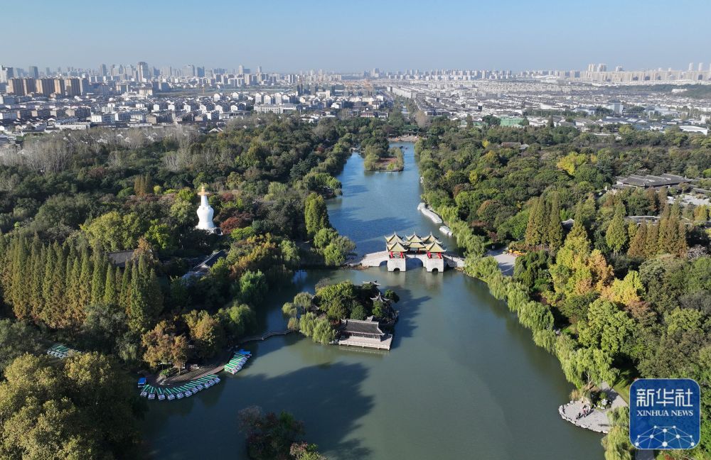 ↑11月17日拍摄的江苏扬州瘦西湖风景区景色(无人机照片)。新华社发(孟德龙摄)