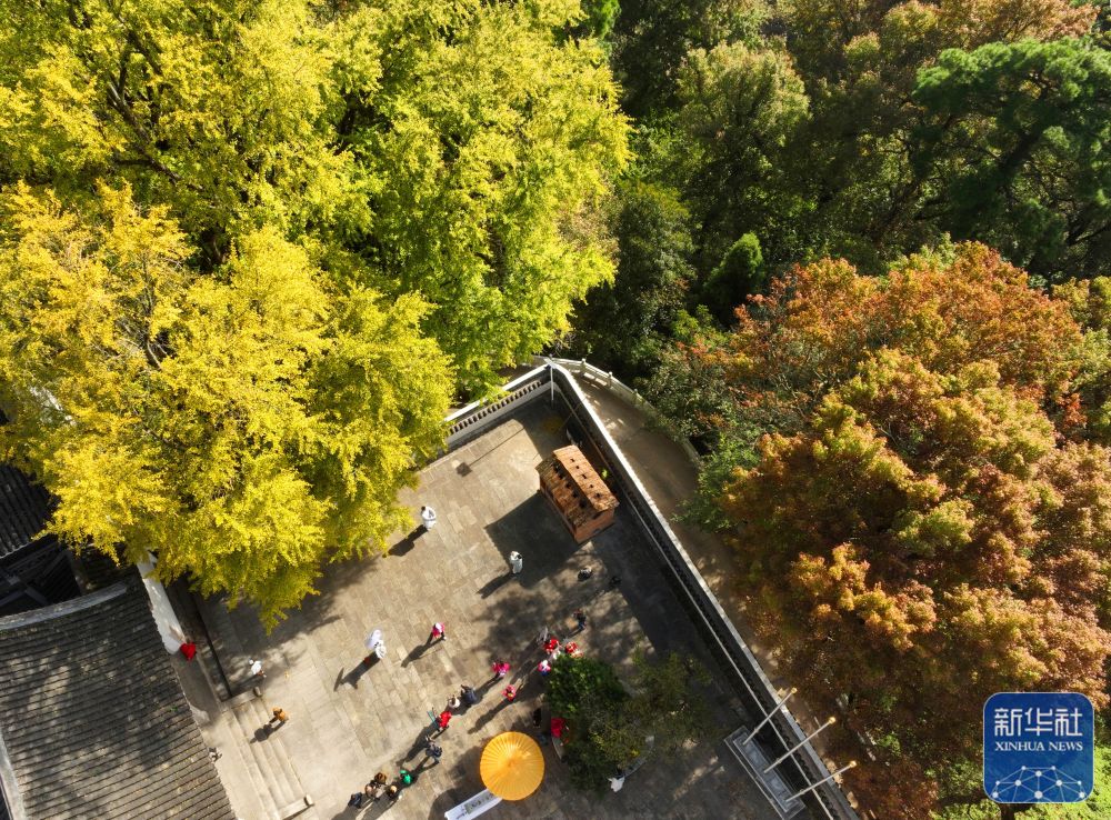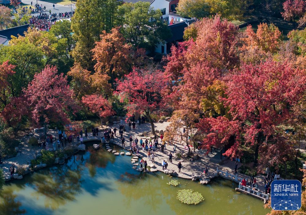 ↑11月18日,游客在江苏省苏州市天平山风景名胜区观赏枫叶景观(无人机照片)。新华社发(王须中摄)