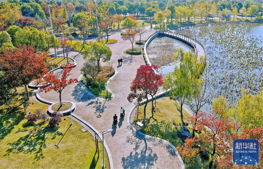 ↑11月18日,市民在江苏省如皋市龙游河生态公园游玩(无人机照片)。新华社发(吴树建摄)