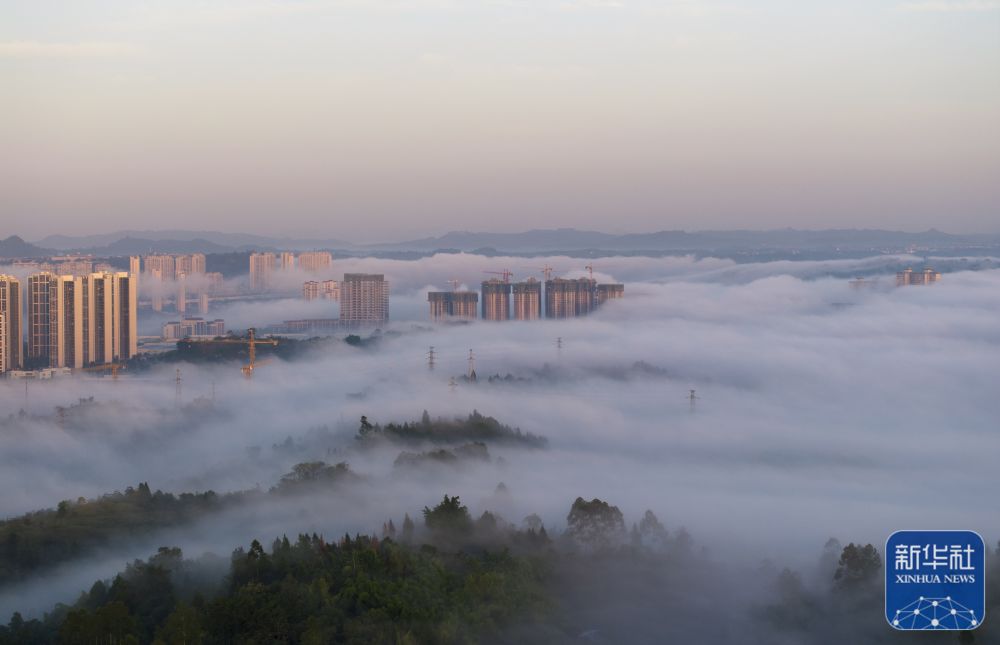 ↑11月17日拍摄的四川省广安市平流雾景观(无人机照片)。新华社发(周修建摄)