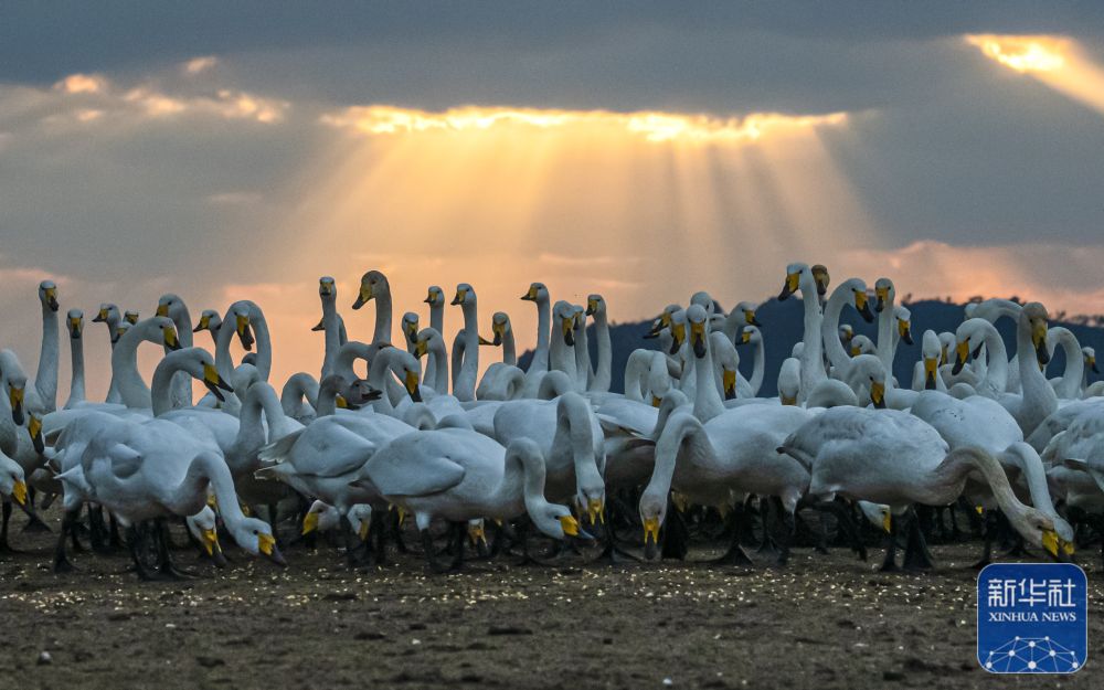 ↑ 11月18日,在山东省荣成大天鹅国家级自然保护区天鹅湖湖畔,一群大天鹅在觅食。新华社发(李信君摄)