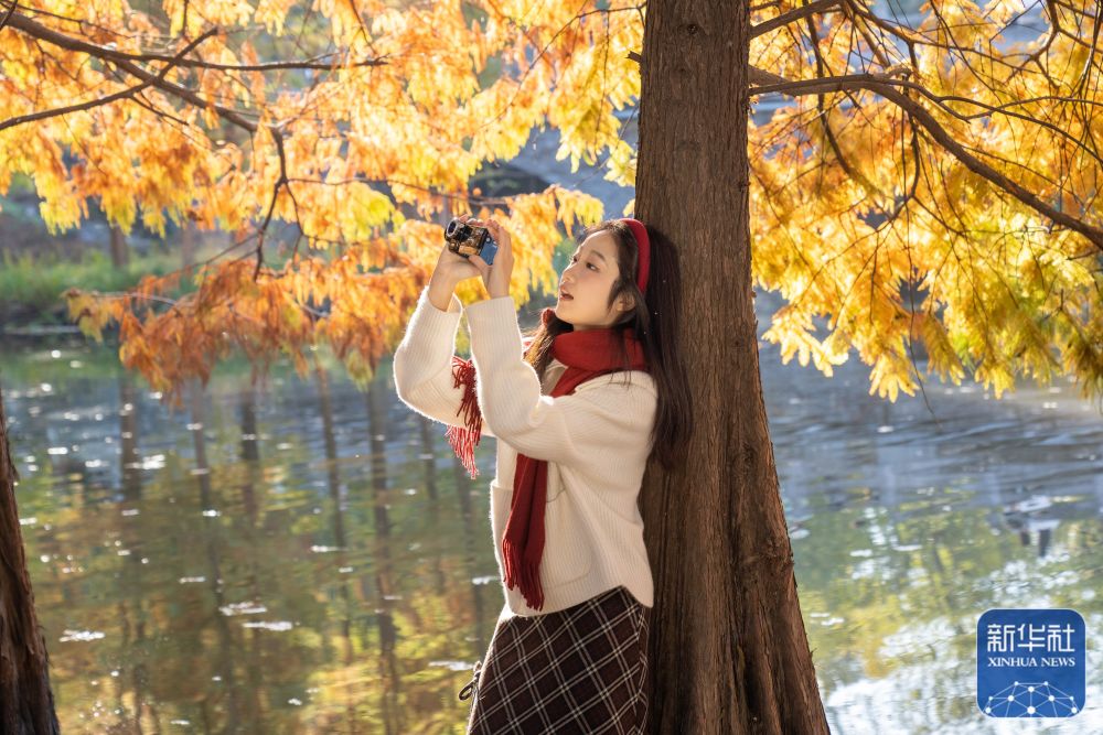 ↑11月18日,游客在江苏南京明孝陵景区燕雀湖游览。新华社发(杜懿摄)