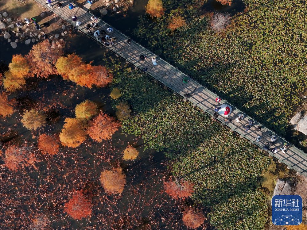 ↑11月18日,游客在山东省烟台市牟平区鱼鸟河湿地公园游玩(无人机照片)。新华社发(唐克摄)