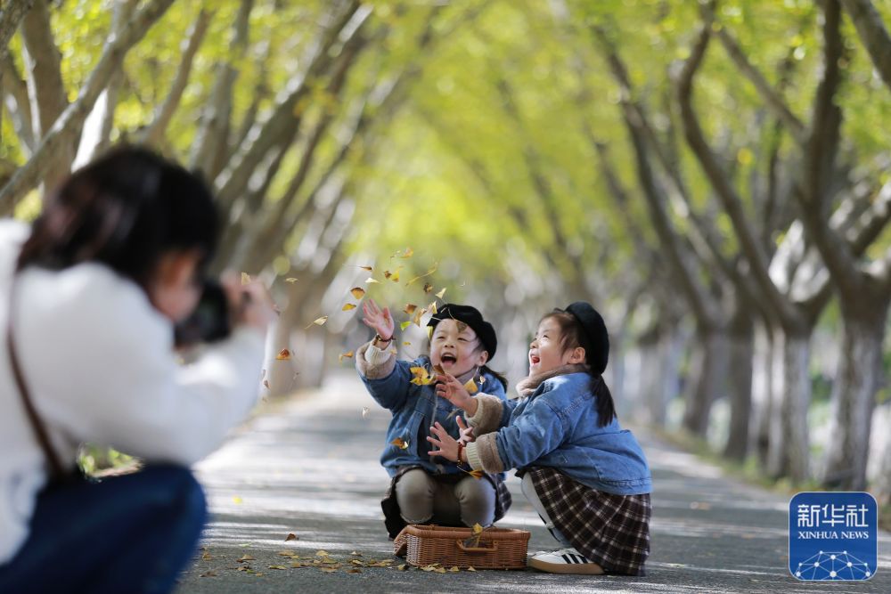 ↑11月18日,小朋友在江苏省扬州市江都区一处公园的“银杏大道”上拍照留念。新华社发(孟德龙摄)