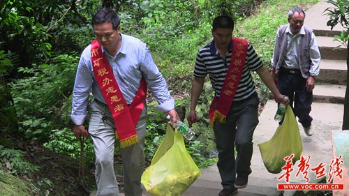 5月27日上午,矿税办主任毛保荣、党组书记傅柏春带领单位32名党员干部志愿者来到云山国家森林公园,举着“市矿税办志愿者服务队”的旗帜,每人身披红色的“市矿税办志愿者”胸巾,手持铁夹、垃圾袋,从入园处开始,将沿途的果皮纸屑、白色垃圾一一捡到垃圾袋中,对云山旅游路线进行了一次全面清扫保洁,受到了云山森林管理所工作人员和游客们的一致好评。
